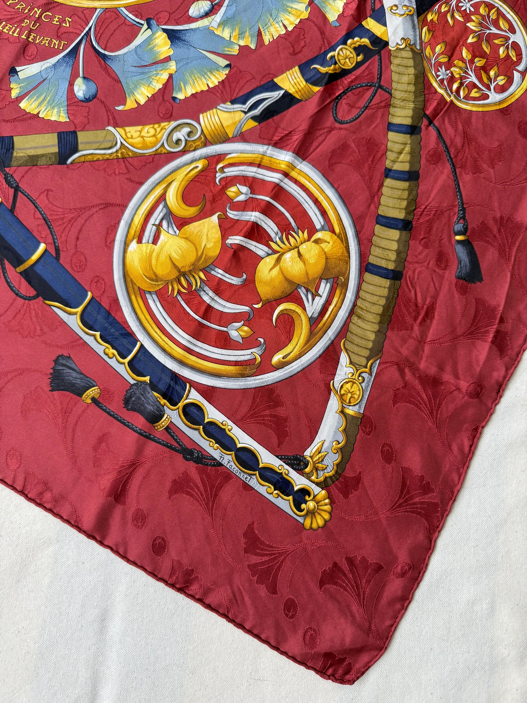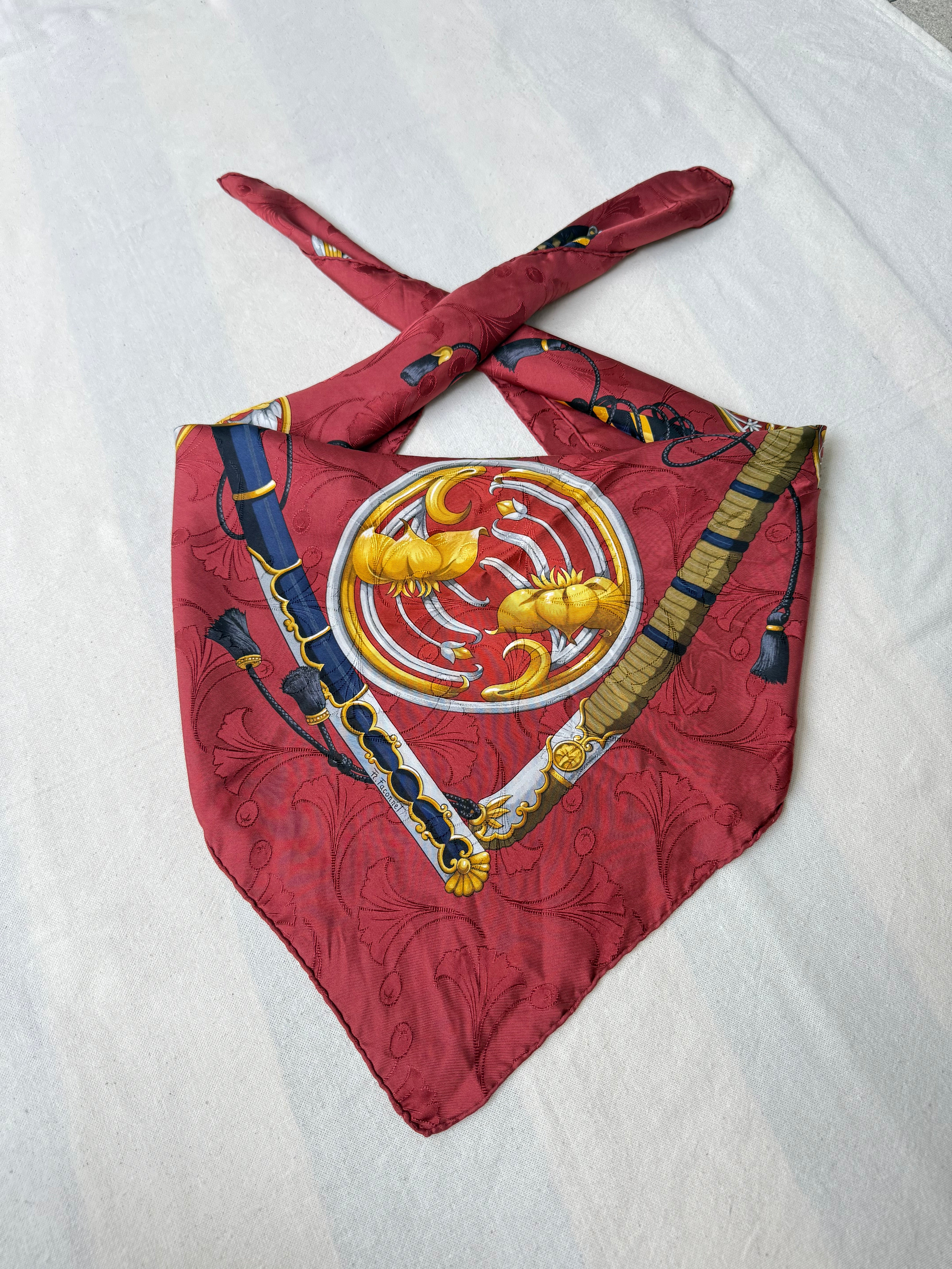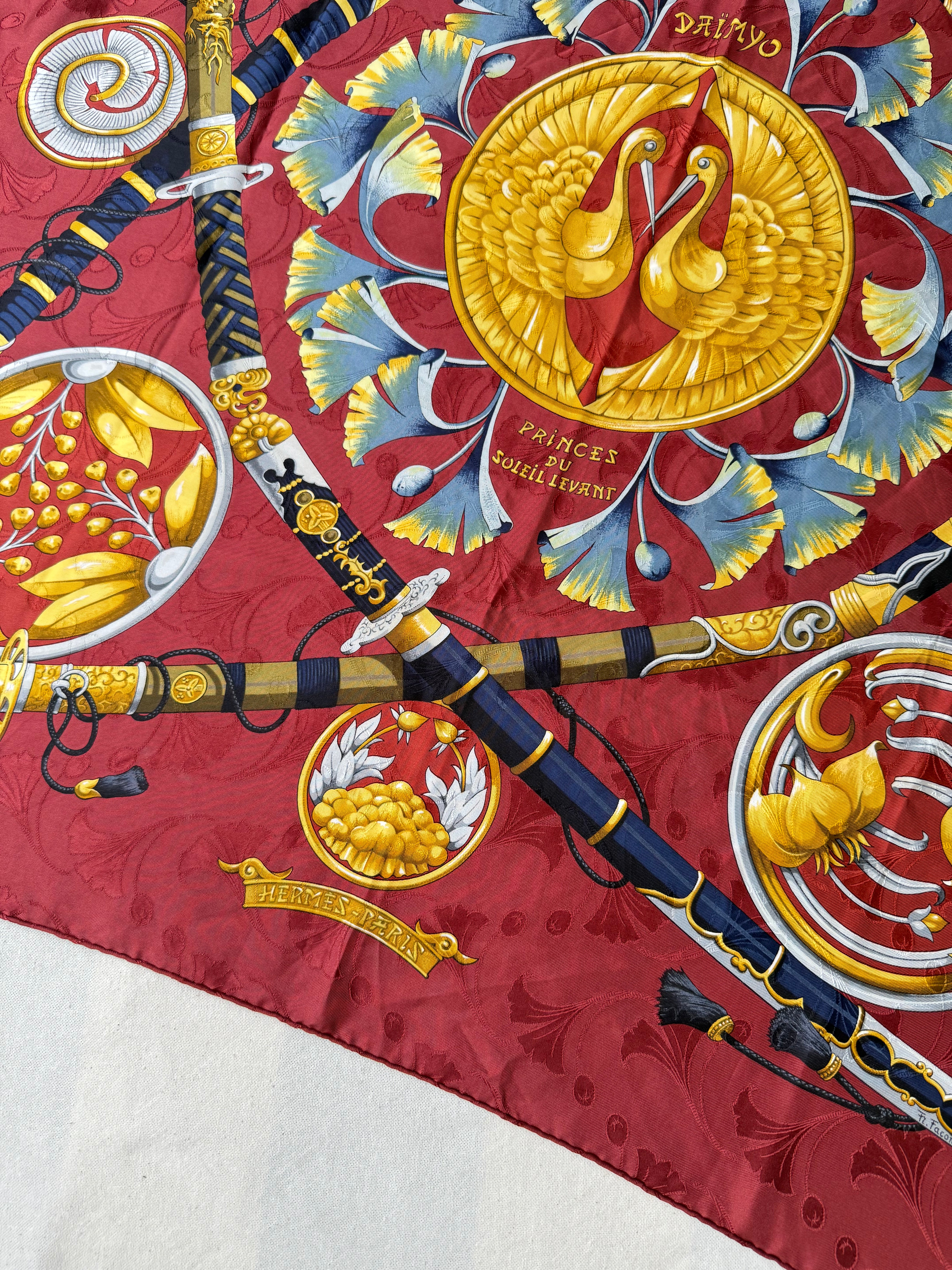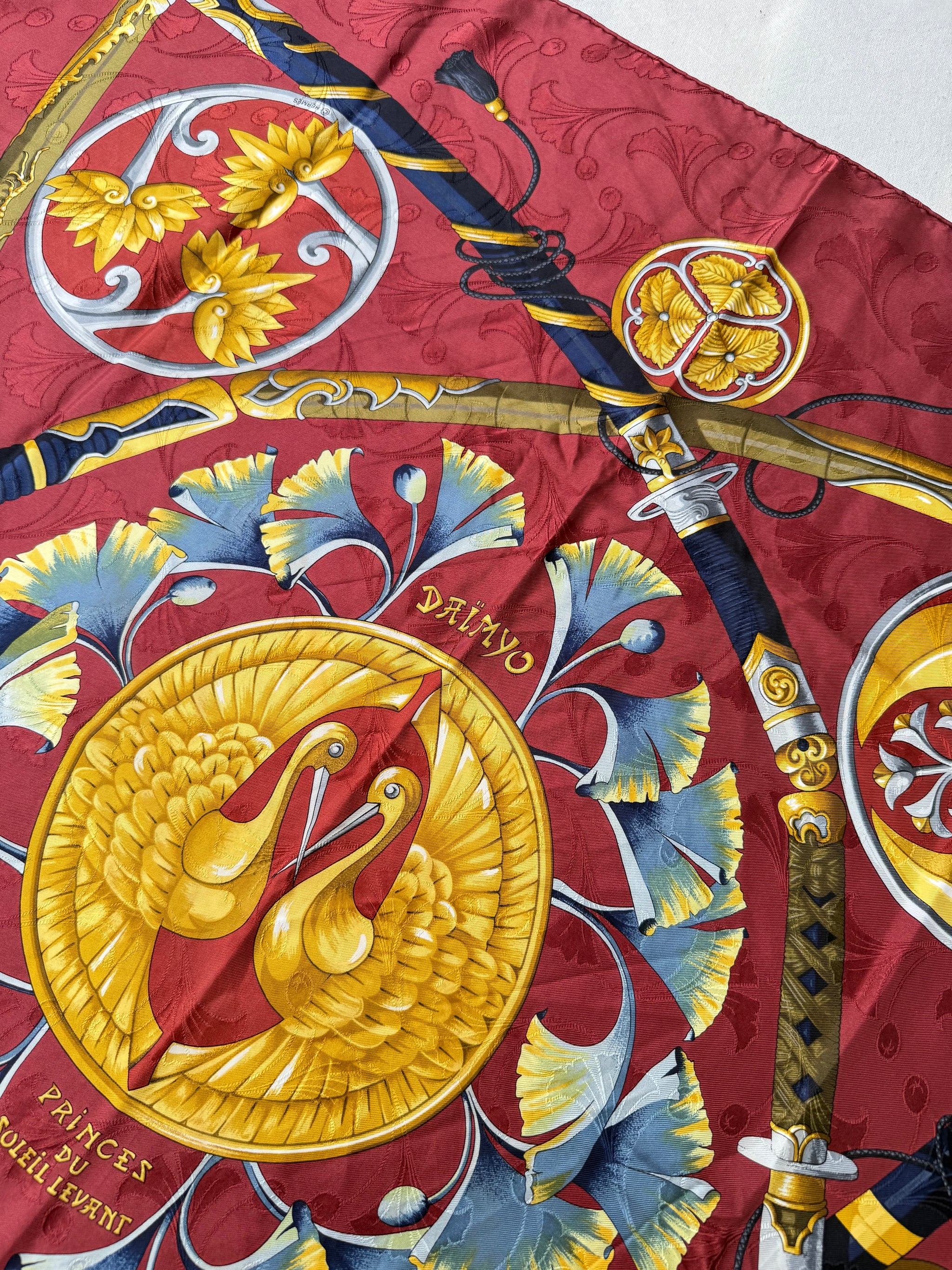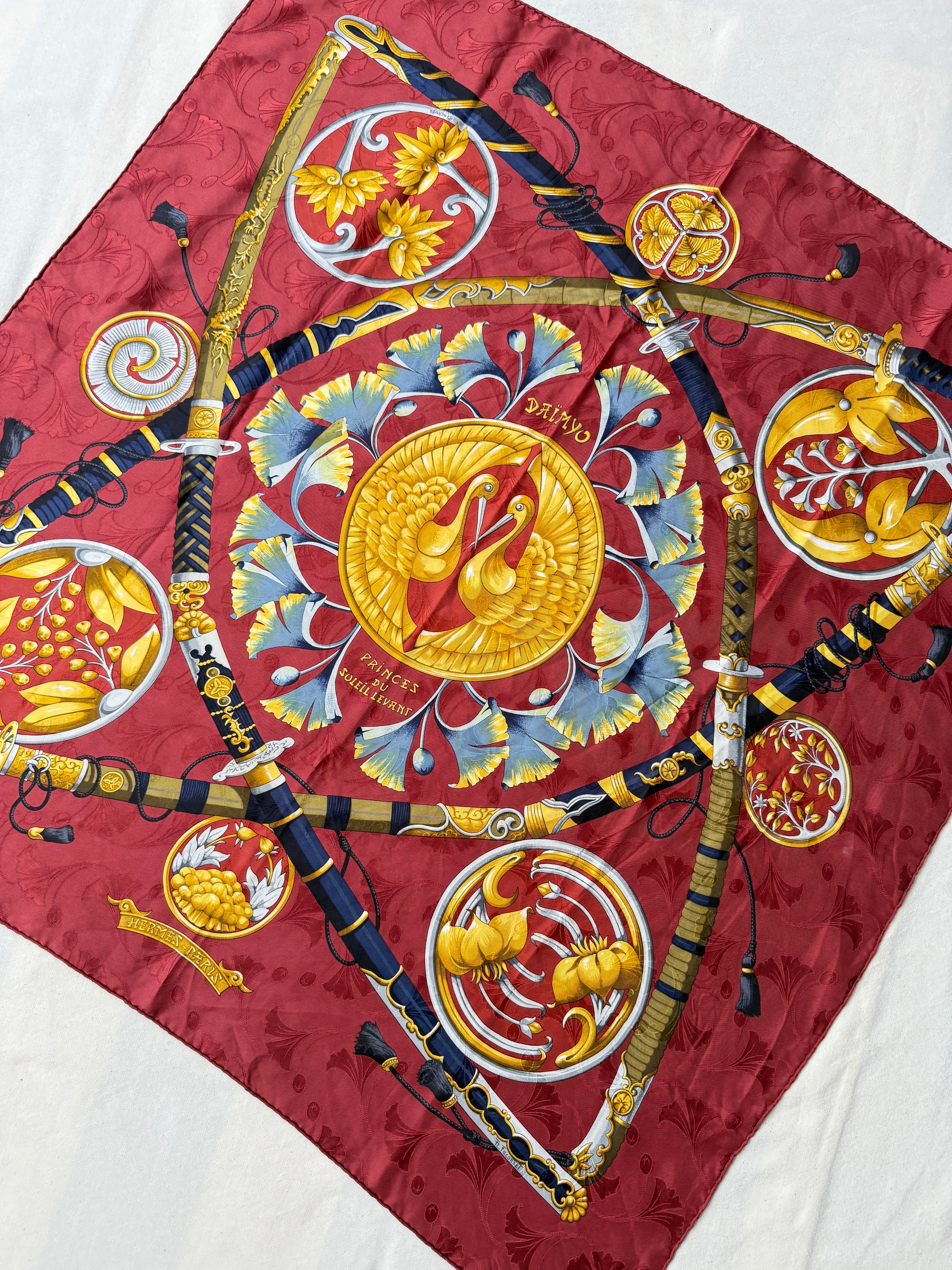 Magnifique foulard Hermès vintage en soie, intitulé Daimyo, hommage raffiné au Japon féodal et à ses emblématiques seigneurs guerriers. Ce carré met en avant un somptueux décor de katanas et sabres japonais richement ornés, entourés de motifs végétaux et floraux stylisés, le tout sublimé par un fond rouge intense. Véritable pièce de collection, ce modèle illustre l’art d’Hermès de marier l’élégance française à des inspirations venues d’ailleurs.